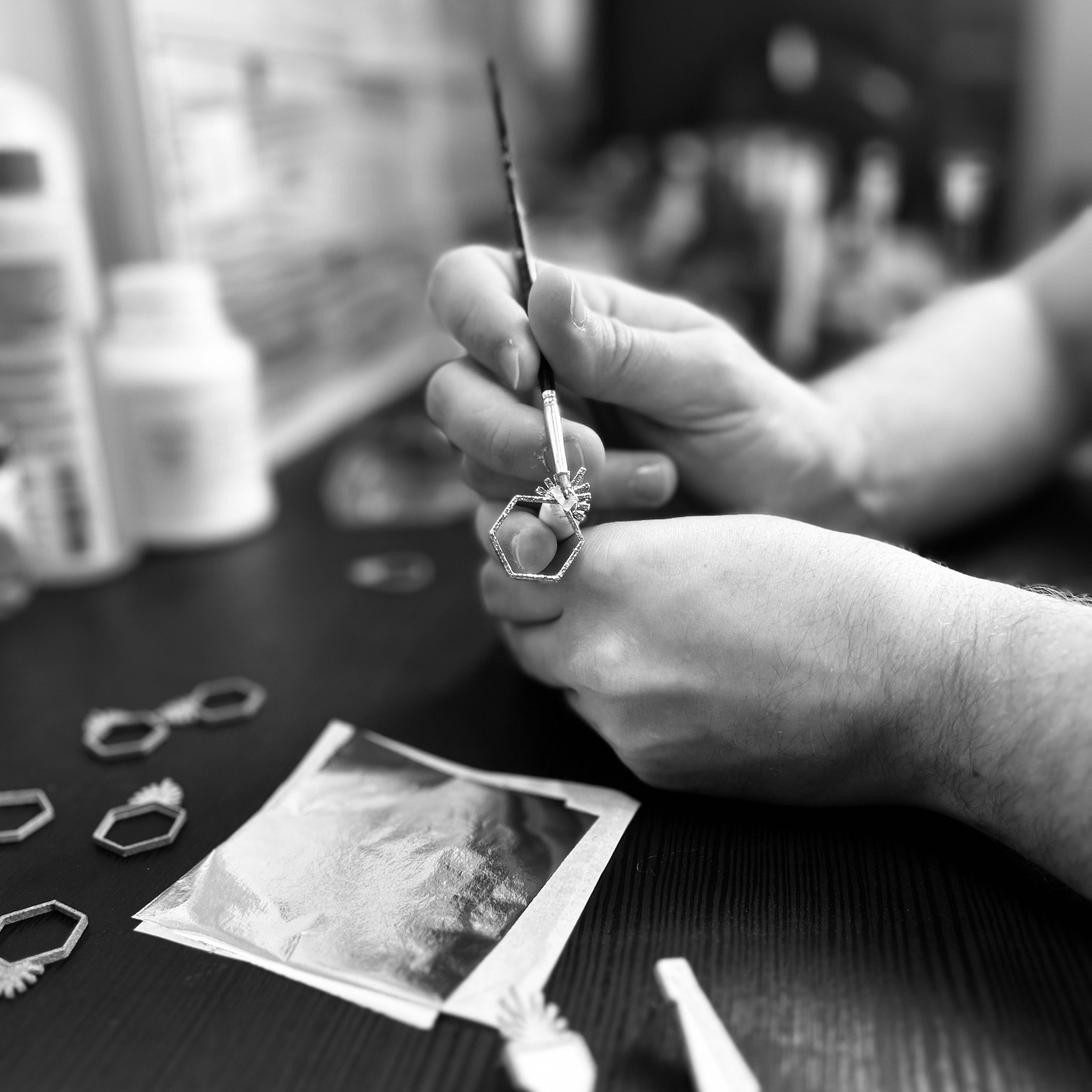 À La Cité, chaque bijou naît d’un geste précis : une coquille Saint-Jacques revalorisée, une dorure à la feuille d’or 24K, et la main de l’artisan qui révèle la lumière.