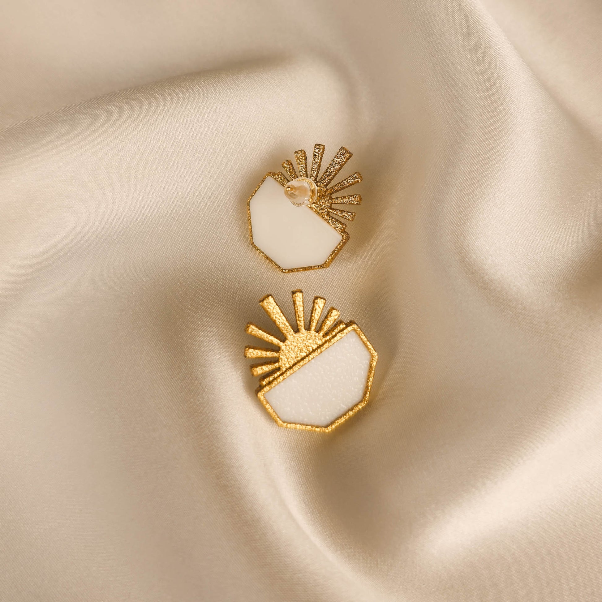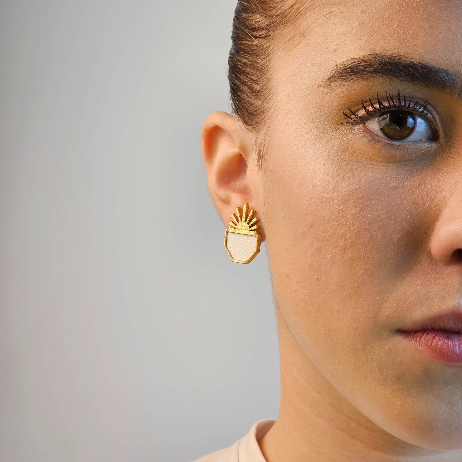 Aurore est une paire de boucles d’oreilles lumineuse et délicate, façonnée à partir de coquille Saint-Jacques revalorisée. puis dorée minutieusement à la feuille d’or 24 carats..