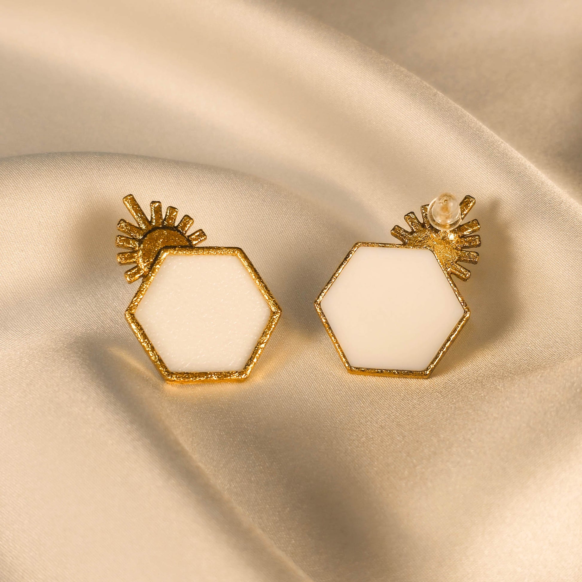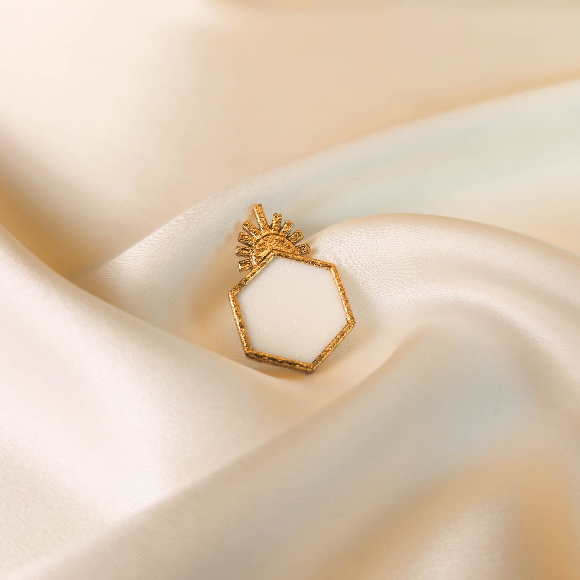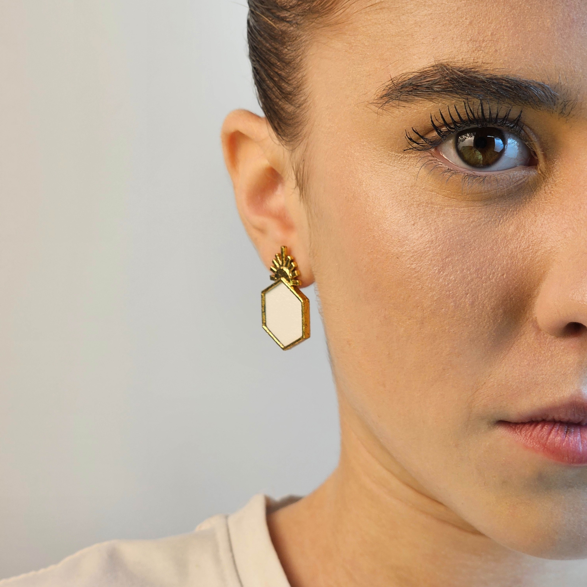 L’Aube est une boucle d’oreille lumineuse et sereine, façonnée à partir de coquille Saint-Jacques revalorisée. puis dorée délicatement à la feuille d’or 24 carats.